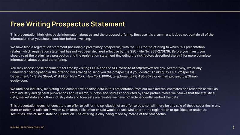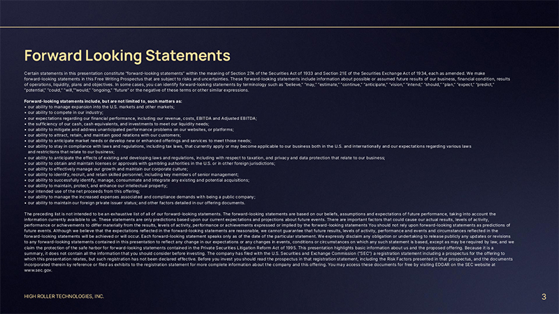 HIGH ROLLER TECHNOLOGIES, INC. Free Writing Prospectus Statement 2 This presentation highlights basic information about us and the proposed offering. Because it is a summary, it does not contain all of the information that you should consider before investing. We have filed a registration statement (including a preliminary prospectus) with the SEC for the offering to which this presentation relates, which registration statement has not yet been declared effective by the SEC (File No. 333-276176). Before you invest, you should read the preliminary prospectus and the registration statement (including the risk factors described therein) for more complete information about us and the offering. You may access these documents for free by visiting EDGAR on the SEC Website at http://www.sec.gov. Alternatively, we or any underwriter participating in the offering will arrange to send you the prospectus if you contact ThinkEquity LLC, Prospectus Department, 17 State Street, 41st Floor, New York, New York 10004, telephone: (877) 436-3673 or e-mail: prospectus@thinkequity. com. We obtained industry, marketing and competitive position data in this presentation from our own internal estimates and research as well as from industry and general publications and research, surveys and studies conducted by third parties. While we believe that the statistical data, market data and other industry data and forecasts are reliable we have not independently verified the data. This presentation does not constitute an offer to sell, or the solicitation of an offer to buy, nor will there be any sale of these securities in any state or other jurisdiction in which such offer, solicitation or sale would be unlawful prior to the registration or qualification under the securities laws of such state or jurisdiction. The offering is only being made by means of the prospectus.
