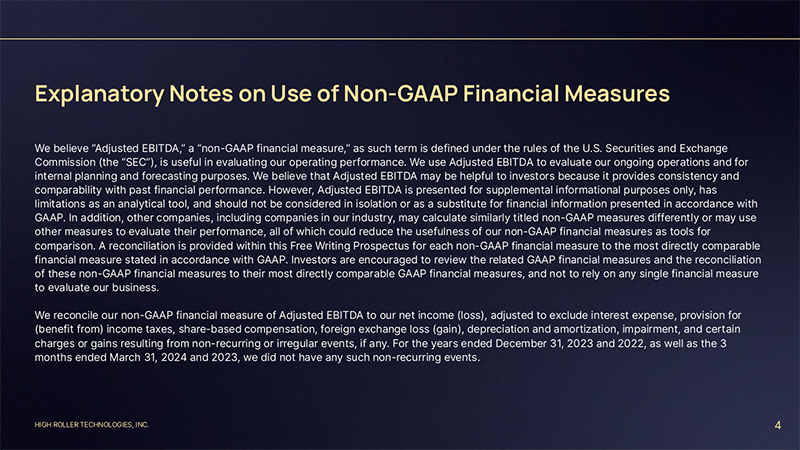 HIGH ROLLER TECHNOLOGIES, INC. Explanatory Notes on Use of Non-GAAP Financial Measures We believe “Adjusted EBITDA,” a “non-GAAP financial measure,” as such term is defined under the rules of the U.S. Securities and Exchange Commission (the “SEC”), is useful in evaluating our operating performance. We use Adjusted EBITDA to evaluate our ongoing operations and for internal planning and forecasting purposes. We believe that Adjusted EBITDA may be helpful to investors because it provides consistency and comparability with past financial performance. However, Adjusted EBITDA is presented for supplemental informational purposes only, has limitations as an analytical tool, and should not be considered in isolation or as a substitute for financial information presented in accordance with GAAP. In addition, other companies, including companies in our industry, may calculate similarly titled non-GAAP measures differently or may use other measures to evaluate their performance, all of which could reduce the usefulness of our non-GAAP financial measures as tools for comparison. A reconciliation is provided within this Free Writing Prospectus for each non-GAAP financial measure to the most directly comparable financial measure stated in accordance with GAAP. Investors are encouraged to review the related GAAP financial measures and the reconciliation of these non-GAAP financial measures to their most directly comparable GAAP financial measures, and not to rely on any single financial measure to evaluate our business. We reconcile our non-GAAP financial measure of Adjusted EBITDA to our net income (loss), adjusted to exclude interest expense, provision for (benefit from) income taxes, share-based compensation, foreign exchange loss (gain), depreciation and amortization, impairment, and certain charges or gains resulting from non-recurring or irregular events, if any. For the years ended December 31, 2023 and 2022, as well as the 3 months ended March 31, 2024 and 2023, we did not have any such non-recurring events. 4