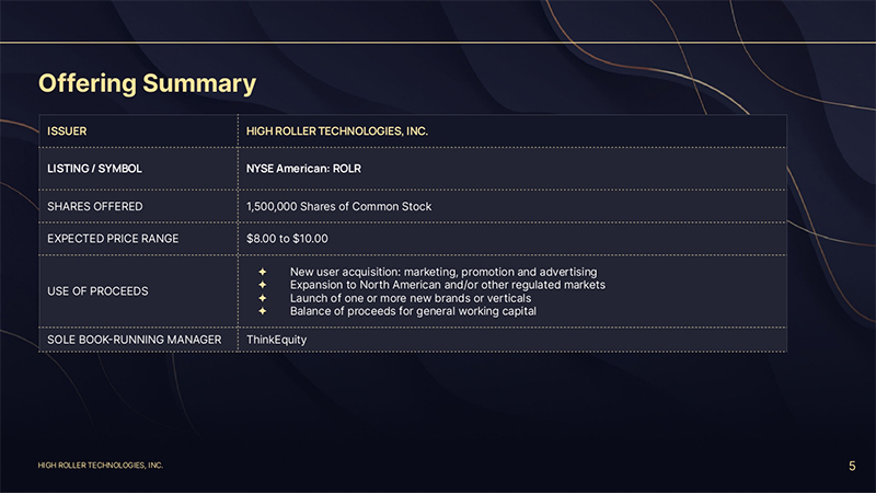 HIGH ROLLER TECHNOLOGIES, INC. Forward Looking Statements 3 Certain statements in this presentation constitute “forward-looking statements” within the meaning of Section 27A of the Securities Act of 1933 and Section 21E of the Securities Exchange Act of 1934, each as amended. We make forward-looking statements in this Free Writing Prospectus that are subject to risks and uncertainties. These forward-looking statements include information about possible or assumed future results of our business, financial condition, results of operations, liquidity, plans and objectives. In some cases, you can identify forward-looking statements by terminology such as “believe,” “may,” “estimate,” “continue,” “anticipate,” “vision,” “intend,” “should,” “plan,” “expect,” “predict,” “potential,” “could,” “will,”“would,” “ongoing,” “future” or the negative of these terms or other similar expressions. Forward-looking statements include, but are not limited to, such matters as: • our ability to manage expansion into the U.S. markets and other markets; • our ability to compete in our industry; • our expectations regarding our financial performance, including our revenue, costs, EBITDA and Adjusted EBITDA; • the sufficiency of our cash, cash equivalents, and investments to meet our liquidity needs; • our ability to mitigate and address unanticipated performance problems on our websites, or platforms; • our ability to attract, retain, and maintain good relations with our customers; • our ability to anticipate market needs or develop new or enhanced offerings and services to meet those needs; • our ability to stay in compliance with laws and regulations, including tax laws, that currently apply or may become applicable to our business both in the U.S. and internationally and our expectations regarding various laws and restrictions that relate to our business; • our ability to anticipate the effects of existing and developing laws and regulations, including with respect to taxation, and privacy and data protection that relate to our business; • our ability to obtain and maintain licenses or approvals with gambling authorities in the U.S. or in other foreign jurisdictions; • our ability to effectively manage our growth and maintain our corporate culture; • our ability to identify, recruit, and retain skilled personnel, including key members of senior management; • our ability to successfully identify, manage, consummate and integrate any existing and potential acquisitions; • our ability to maintain, protect, and enhance our intellectual property; • our intended use of the net proceeds from this offering; • our ability to manage the increased expenses associated and compliance demands with being a public company; • our ability to maintain our foreign private issuer status; and other factors detailed in our offering documents. The preceding list is not intended to be an exhaustive list of all of our forward-looking statements. The forward-looking statements are based on our beliefs, assumptions and expectations of future performance, taking into account the information currently available to us. These statements are only predictions based upon our current expectations and projections about future events. There are important factors that could cause our actual results, levels of activity, performance or achievements to differ materially from the results, levels of activity, performance or achievements expressed or implied by the forward-looking statements You should not rely upon forward-looking statements as predictions of future events. Although we believe that the expectations reflected in the forward-looking statements are reasonable, we cannot guarantee that future results, levels of activity, performance and events and circumstances reflected in the forward-looking statements will be achieved or will occur. Each forward-looking statement speaks only as of the date of the particular statement. We expressly disclaim any obligation or undertaking to release publicly any updates or revisions to any forward-looking statements contained in this presentation to reflect any change in our expectations or any changes in events, conditions or circumstances on which any such statement is based, except as may be required by law, and we claim the protection of the safe harbor for forward-looking statements contained in the Private Securities Litigation Reform Act of 1995. This presentation highlights basic information about us and the proposed offering. Because it is a summary, it does not contain all the information that you should consider before investing. The company has filed with the U.S. Securities and Exchange Commission (“SEC”) a registration statement including a prospectus for the offering to which this presentation relates, but such registration has not been declared effective. Before you invest you should read the prospectus in that registration statement, including the Risk Factors presented in that prospectus, and the documents incorporated therein by reference or filed as exhibits to the registration statement for more complete information about the company and this offering. You may access these documents for free by visiting EDGAR on the SEC website at www.sec.gov.