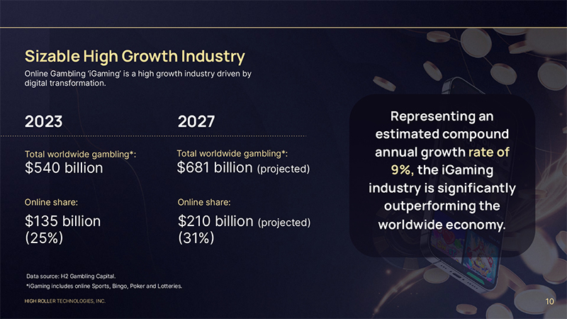 HIGH ROLLER TECHNOLOGIES, INC Strong Revenue Growth Potential Through New Market Expansion Size of our existing addressable market: $3.3B* Our revenue: $29.7M** 9 Size of the world iGaming addressable market: $135B* Expansion strategy: Accelerate growth into our existing markets, investment into technology and secure market access to increase addressable market size *Data source: H2 Gambling Capital. **Year ended December 31, 2023