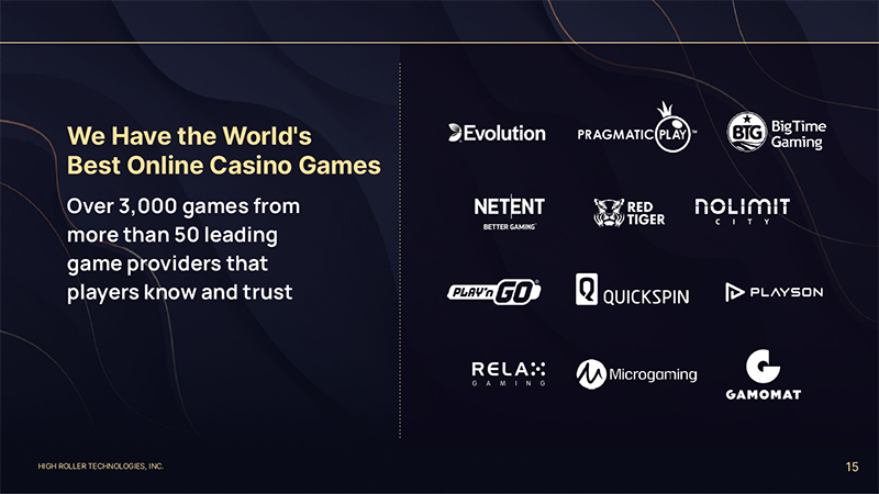 HIGH ROLLER TECHNOLOGIES, INC. 15 We Have the World's Best Online Casino Games Over 3,000 games from more than 50 leading game providers that players know and trust