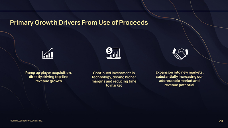 HIGH ROLLER TECHNOLOGIES, INC. Desktop End-to-End Tech Strategy 19 Website and mobile solutions Content, supplier and lobby management Casino content and payment supplier integrations Player account management Single source of truth database, real-time data broker Bonuses, promotions and segmentation Operational automation of key functions AI driven content management system Platform Tablet Mobile (iOS + Android) Proprietary Third-Party: Pragmatic