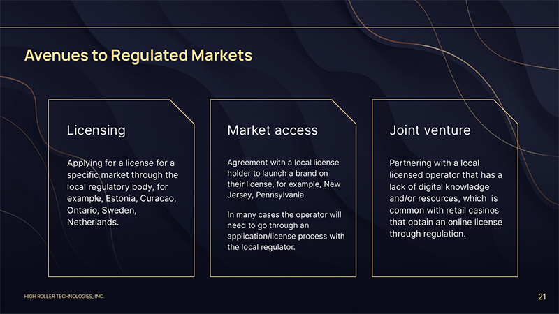 HIGH ROLLER TECHNOLOGIES, INC. 21 Licensing Market access Applying for a license for a specific market through the local regulatory body, for example, Estonia, Curacao, Ontario, Sweden, Netherlands. Agreement with a local license holder to launch a brand on their license, for example, New Jersey, Pennsylvania. In many cases the operator will need to go through an application/license process with the local regulator. Joint venture Partnering with a local licensed operator that has a lack of digital knowledge and/or resources, which is common with retail casinos that obtain an online license through regulation. Avenues to Regulated Markets