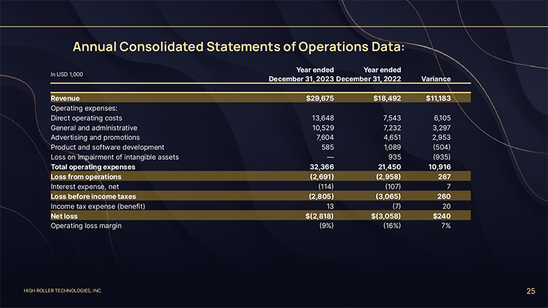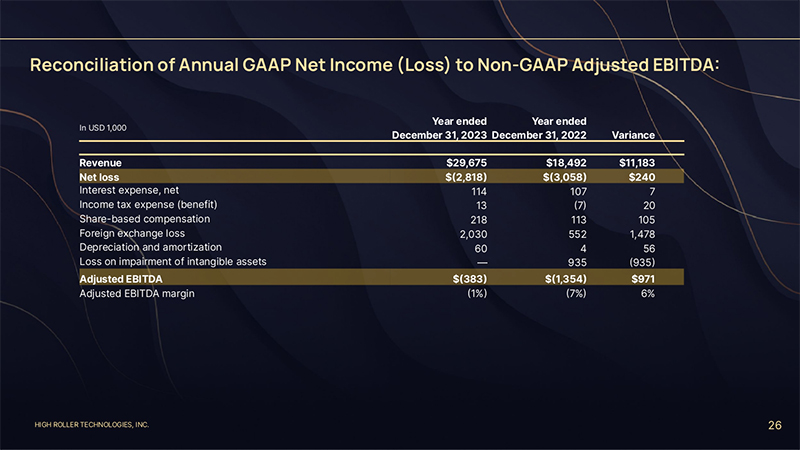 HIGH ROLLER TECHNOLOGIES, INC. 25 Annual Consolidated Statements of Operations Data: In USD 1,000 Year ended December 31, 2023 Year ended December 31, 2022 Variance Revenue $29,675 $18,492 $11,183 Operating expenses: Direct operating costs 13,648 7,543 6,105 General and administrative 10,529 7,232 3,297 Advertising and promotions 7,604 4,651 2,953 Product and software development 585 1,089 (504) Loss on impairment of intangible assets — 935 (935) Total operating expenses 32,366 21,450 10,916 Loss from operations (2,691) (2,958) 267 Interest expense, net (114) (107) 7 Loss before income taxes (2,805) (3,065) 260 Income tax expense (benefit) 13 (7) 20 Net loss $(2,818) $(3,058) $240 Operating loss margin (9%) (16%) 7%