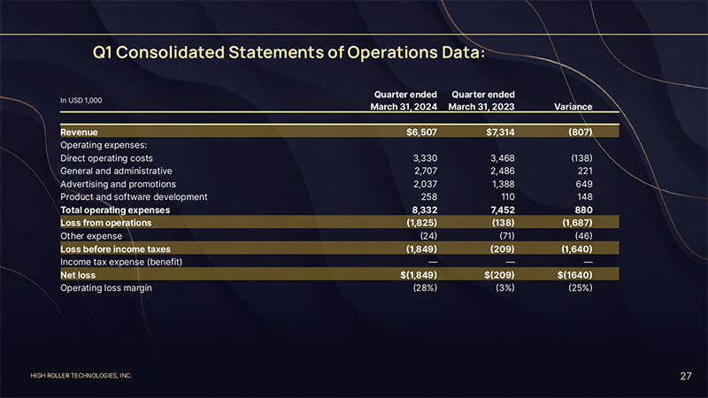 HIGH ROLLER TECHNOLOGIES, INC. 27 Q1 Consolidated Statements of Operations Data: In USD 1,000 Quarter ended March 31, 2024 Quarter ended March 31, 2023 Variance Revenue $6,507 $7,314 (807) Operating expenses: Direct operating costs 3,330 3,468 (138) General and administrative 2,707 2,486 221 Advertising and promotions 2,037 1,388 649 Product and software development 258 110 148 Total operating expenses 8,332 7,452 880 Loss from operations (1,825) (138) (1,687) Other expense (24) (71) (46) Loss before income taxes (1,849) (209) (1,640) Income tax expense (benefit) — — — Net loss $(1,849) $(209) $(1640) Operating loss margin (28%) (3%) (25%)