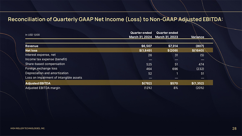 HIGH ROLLER TECHNOLOGIES, INC. 28 Reconciliation of Quarterly GAAP Net Income (Loss) to Non-GAAP Adjusted EBITDA: In USD 1,000 Quarter ended March 31, 2024 Quarter ended March 31, 2023 Variance Revenue $6,507 $7,314 (807) Net loss $(1,849) $(209) $(1640) Interest expense, net 26 31 (5) Income tax expense (benefit) — — — Share-based compensation 525 51 474 Foreign exchange loss 464 696 (232) Depreciation and amortization 52 1 51 Loss on impairment of intangible assets — — — Adjusted EBITDA $(782) $570 $(1,352) Adjusted EBITDA margin (12%) 8% (20%)