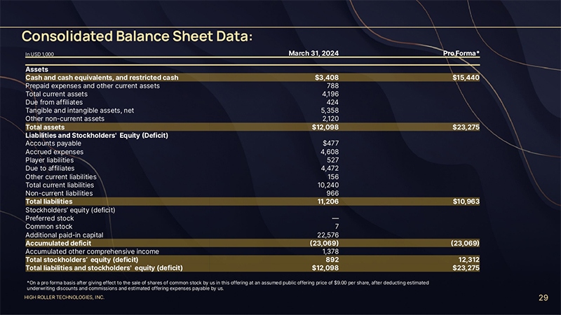 HIGH ROLLER TECHNOLOGIES, INC. 29 Consolidated Balance Sheet Data: In USD 1,000 March 31, 2024 Pro Forma* Assets Cash and cash equivalents, and restricted cash $3,408 $15,440 Prepaid expenses and other current assets 788 Total current assets 4,196 Due from affiliates 424 Tangible and intangible assets, net 5,358 Other non-current assets 2,120 Total assets $12,098 $23,275 Liabilities and Stockholders' Equity (Deficit) Accounts payable $477 Accrued expenses 4,608 Player liabilities 527 Due to affiliates 4,472 Other current liabilities 156 Total current liabilities 10,240 Non-current liabilities 966 Total liabilities 11,206 $10,963 Stockholders’ equity (deficit) Preferred stock — Common stock 7 Additional paid-in capital 22,576 Accumulated deficit (23,069) (23,069) Accumulated other comprehensive income 1,378 Total stockholders’ equity (deficit) 892 12,312 Total liabilities and stockholders' equity (deficit) $12,098 $23,275 *On a pro forma basis after giving effect to the sale of shares of common stock by us in this offering at an assumed public offering price of $9.00 per share, after deducting estimated underwriting discounts and commissions and estimated offering expenses payable by us.