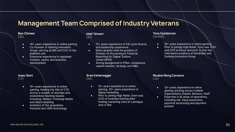HIGH ROLLER TECHNOLOGIES, INC. 30 Ben Clemes CEO Ma Teinert CFO ● 18+ years experience in online gaming ● Co-founder of Gaming Innovation Group, serving as MD and CCO of the platform unit ● Extensive experience in regulated markets, casino and business development ● 12+ years experience of full cycle finance and leadership experience ● Most recently held the position of Director of Accounting & Financial Reporting for Digital Turbine (ticker:APPS) ● Strong background in FP&A, compliance, capital markets, strategy and M&A Management Team Comprised of Industry Veterans Tony Kjaldstrom GM Malta ● 16+ years experience in online gaming ● Prior to joining High Roller, Tony was COO and CPO at Rootz and prior to that has held senior positions at NordicBet and Gaming Innovation Group Isaac Sant CTO ● 10+ years experience in online gaming, holding the title of CTO across a number of startups and established iGaming brands including; Wetten, Frontloop Media and eSportsbetting ● Architect of the proprietary frontend and CMS technology Sven Kaltenegger CMO ● 10+ years experience in online gaming, 25+ years experience in digital marketing ● Prior to joining High Roller, Sven was CCO at Casimba Gaming after holding marketing roles at LeoVegas and LV Bet Reuben Borg Caruana COO ● 13+ years experience in online gaming working across multiple organisations; Expekt, Betsson, Kwiff ● Expertise in all areas of operations, including risk, fraud prevention, payment processing and payment product