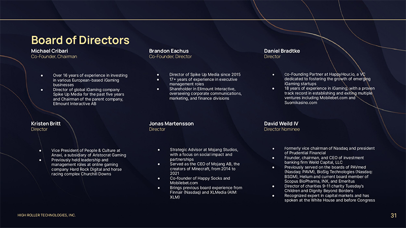 HIGH ROLLER TECHNOLOGIES, INC. 31 Michael Cribari Co-Founder, Chairman Brandon Eachus Co-Founder, Director ● Over 16 years of experience in investing in various European-based iGaming businesses ● Director of global iGaming company Spike Up Media for the past five years and Chairman of the parent company, Ellmount Interactive AB ● Director of Spike Up Media since 2015 ● 17+ years of experience in executive management roles ● Shareholder in Ellmount Interactive, overseeing corporate communications, marketing, and finance divisions Board of Directors Daniel Bradtke Director ● Co-Founding Partner at HappyHour.io, a VC dedicated to fostering the growth of emerging iGaming startups ● 18 years of experience in iGaming, with a proven track record in establishing and exiting multiple ventures including Mobilebet.com and Suomikasino.com Kristen Bri Director ● Vice President of People & Culture at Anaxi, a subsidiary of Aristocrat Gaming ● Previously held leadership and management roles at online gaming company Hard Rock Digital and horse racing complex Churchill Downs Jonas Martensson Director ● Strategic Advisor at Mojang Studios, with a focus on social impact and partnerships ● Served as the CEO of Mojang AB, the creators of Minecraft, from 2014 to 2021 ● Co-founder of Happy Socks and Mobilebet.com ● Brings previous board experience from Finnair (Nasdaq) and XLMedia (AIM: XLM) David Weild IV Director Nominee ● Formerly vice chairman of Nasdaq and president of Prudential Financial ● Founder, chairman, and CEO of investment banking firm Weild Capital, LLC ● Previously served on the boards of PAVmed (Nasdaq: PAVM), BioSig Technologies (Nasdaq: BSGM), Helium and current board member of Scopus BioPharma, INX, and Emeritus ● Director of charities 9-11 charity Tuesday’s Children and Dignity Beyond Borders ● Recognized expert in capital markets and has spoken at the White House and before Congress