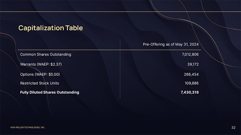 HIGH ROLLER TECHNOLOGIES, INC. 32 Capitalization Table Pre-Offering as of May 31, 2024 Common Shares Outstanding 7,012,806 Warrants (WAEP: $2.37) 39,172 Options (WAEP: $5.00) Restricted Stock Units 268,454 109,886 Fully Diluted Shares Outstanding 7,430,318
