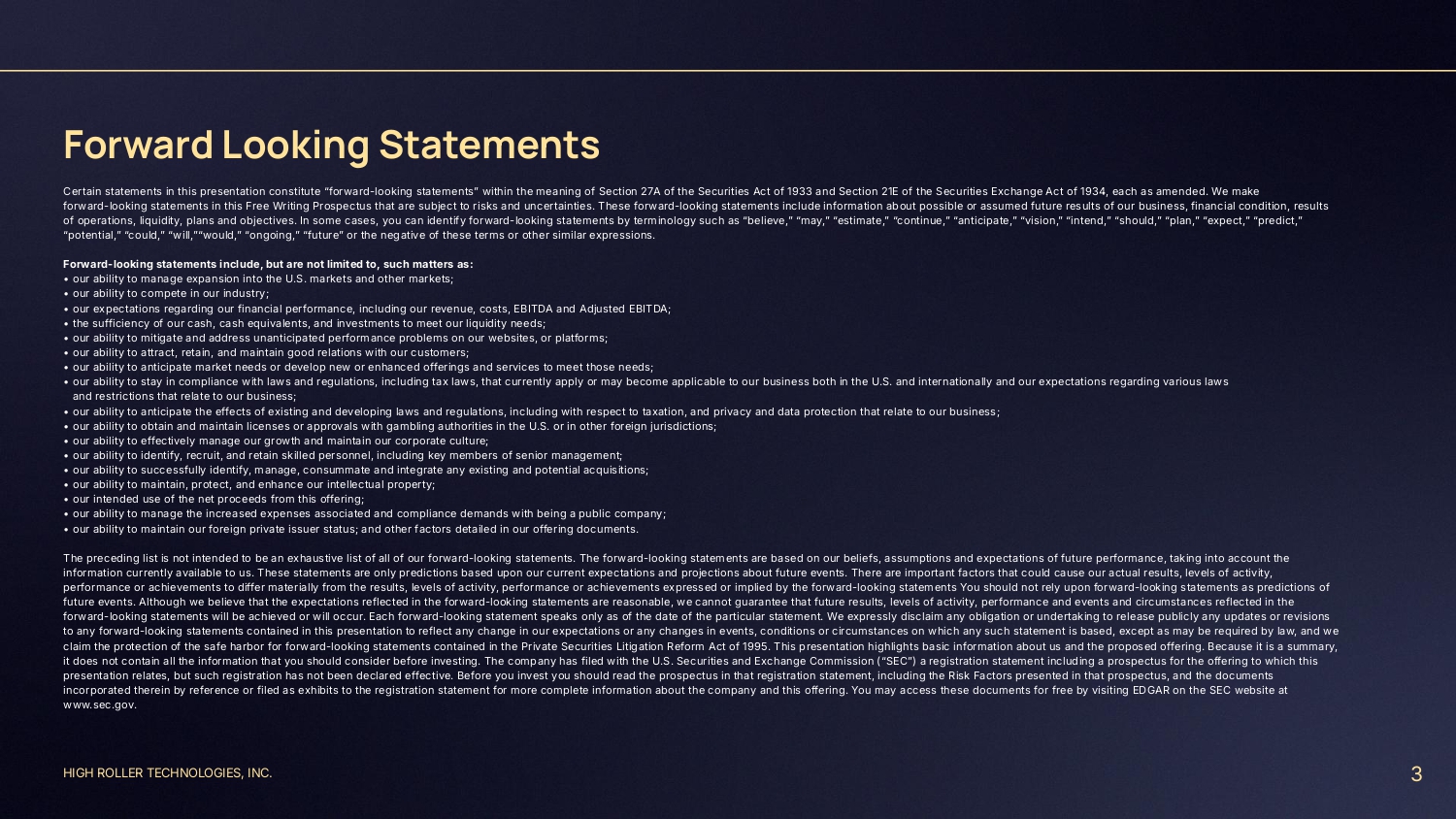 Free Writing Prospectus Statement This presentation highlights basic information about us and the proposed offering. Because it is a summary, it does not contain all of the information that you should consider before investing. We have filed a registration statement (including a preliminary prospectus) with the SEC for the offering to which this presentation relates, which registration statement has not yet been declared effective by the SEC File No. 333276176 . Before you invest, you should read the preliminary prospectus and the registration statement (including the risk factors described therein) for more complete information about us and the offering. You may access these documents for free by visiting EDGAR on the SEC Website at http://www.sec.gov. Alternatively, we or any underwriter participating in the offering will arrange to send you the prospectus if you contact ThinkEquity LLC, Prospectus Department, 17 State Street, 41st Floor, New York, New York 10004, telephone: 877 4363673 or e-mail: prospectus@thinkequity.com. We obtained industry, marketing and competitive position data in this presentation from our own internal estimates and research as well as from industry and general publications and research, surveys and studies conducted by third parties. While we believe that the statistical data, market data and other industry data and forecasts are reliable we have not independently verified the data. This presentation does not constitute an offer to sell, or the solicitation of an offer to buy, nor will there be any sale of these securities in any state or other jurisdiction in which such offer, solicitation or sale would be unlawful prior to the registration or qualification under the securities laws of such state or jurisdiction. The offering is only being made by means of the prospectus. HIGH ROLLER TECHNOLOGIES, INC. 2