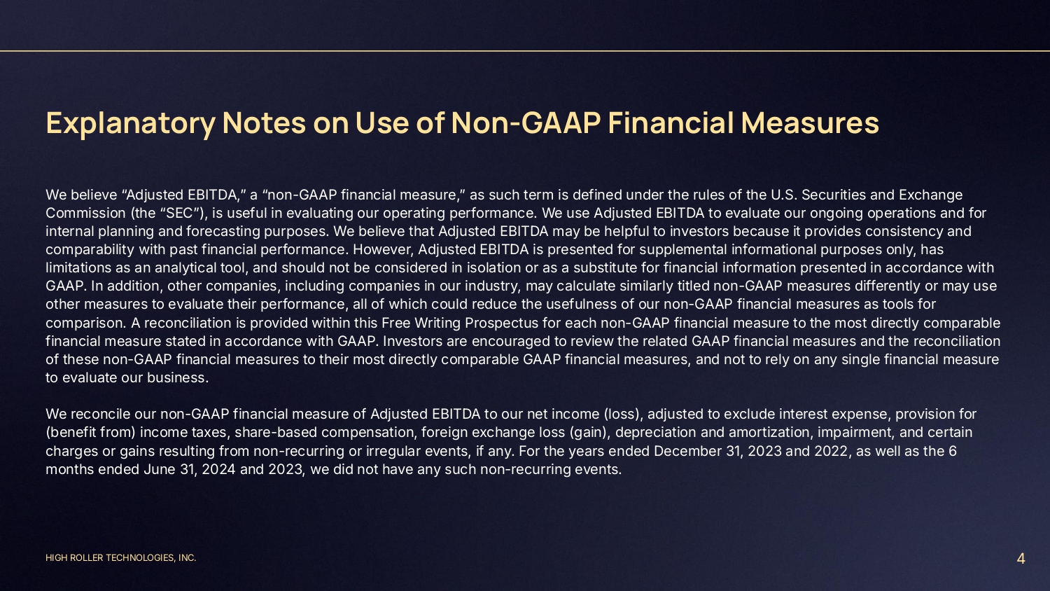 Explanatory Notes on Use of Non-GAAP Financial Measures We believe “Adjusted EBITDA,ˮ a “non-GAAP financial measure,ˮ as such term is defined under the rules of the U.S. Securities and Exchange Commission (the “SECˮ), is useful in evaluating our operating performance. We use Adjusted EBITDA to evaluate our ongoing operations and for internal planning and forecasting purposes. We believe that Adjusted EBITDA may be helpful to investors because it provides consistency and comparability with past financial performance. However, Adjusted EBITDA is presented for supplemental informational purposes only, has limitations as an analytical tool, and should not be considered in isolation or as a substitute for financial information presented in accordance with GAAP. In addition, other companies, including companies in our industry, may calculate similarly titled non-GAAP measures differently or may use other measures to evaluate their performance, all of which could reduce the usefulness of our non-GAAP financial measures as tools for comparison. A reconciliation is provided within this Free Writing Prospectus for each non-GAAP financial measure to the most directly comparable financial measure stated in accordance with GAAP. Investors are encouraged to review the related GAAP financial measures and the reconciliation of these non-GAAP financial measures to their most directly comparable GAAP financial measures, and not to rely on any single financial measure to evaluate our business. We reconcile our non-GAAP financial measure of Adjusted EBITDA to our net income (loss), adjusted to exclude interest expense, provision for (benefit from) income taxes, share-based compensation, foreign exchange loss (gain), depreciation and amortization, impairment, and certain charges or gains resulting from non-recurring or irregular events, if any. For the years ended December 31, 2023 and 2022, as well as the 6 months ended June 31, 2024 and 2023, we did not have any such non-recurring events. HIGH ROLLER TECHNOLOGIES, INC. 4