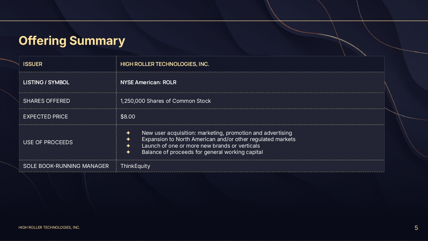Offering Summary ISSUER HIGH ROLLER TECHNOLOGIES, INC. LISTING / SYMBOL NYSE American: ROLR SHARES OFFERED 1,250,000 Shares of Common Stock EXPECTED PRICE $8.00 USE OF PROCEEDS SOLE BOOKRUNNING MANAGER HIGH ROLLER TECHNOLOGIES, INC. ✦ ✦ ✦ ✦ New user acquisition: marketing, promotion and advertising Expansion to North American and/or other regulated markets Launch of one or more new brands or verticals Balance of proceeds for general working capital ThinkEquity 5