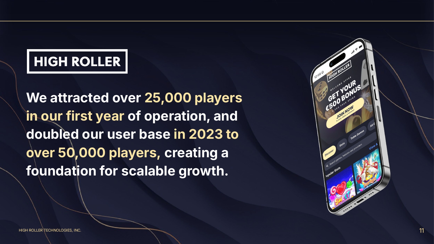 We attracted over 25,000 players in our first year of operation, and doubled our user base in 2023 to over 50,000 players, creating a foundation for scalable growth. HIGH ROLLER TECHNOLOGIES, INC. 11