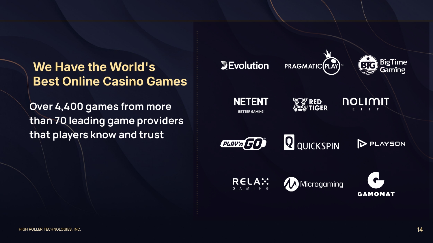 We Have the World's Best Online Casino Games Over 4,400 games from more than 70 leading game providers that players know and trust HIGH ROLLER TECHNOLOGIES, INC. 14
