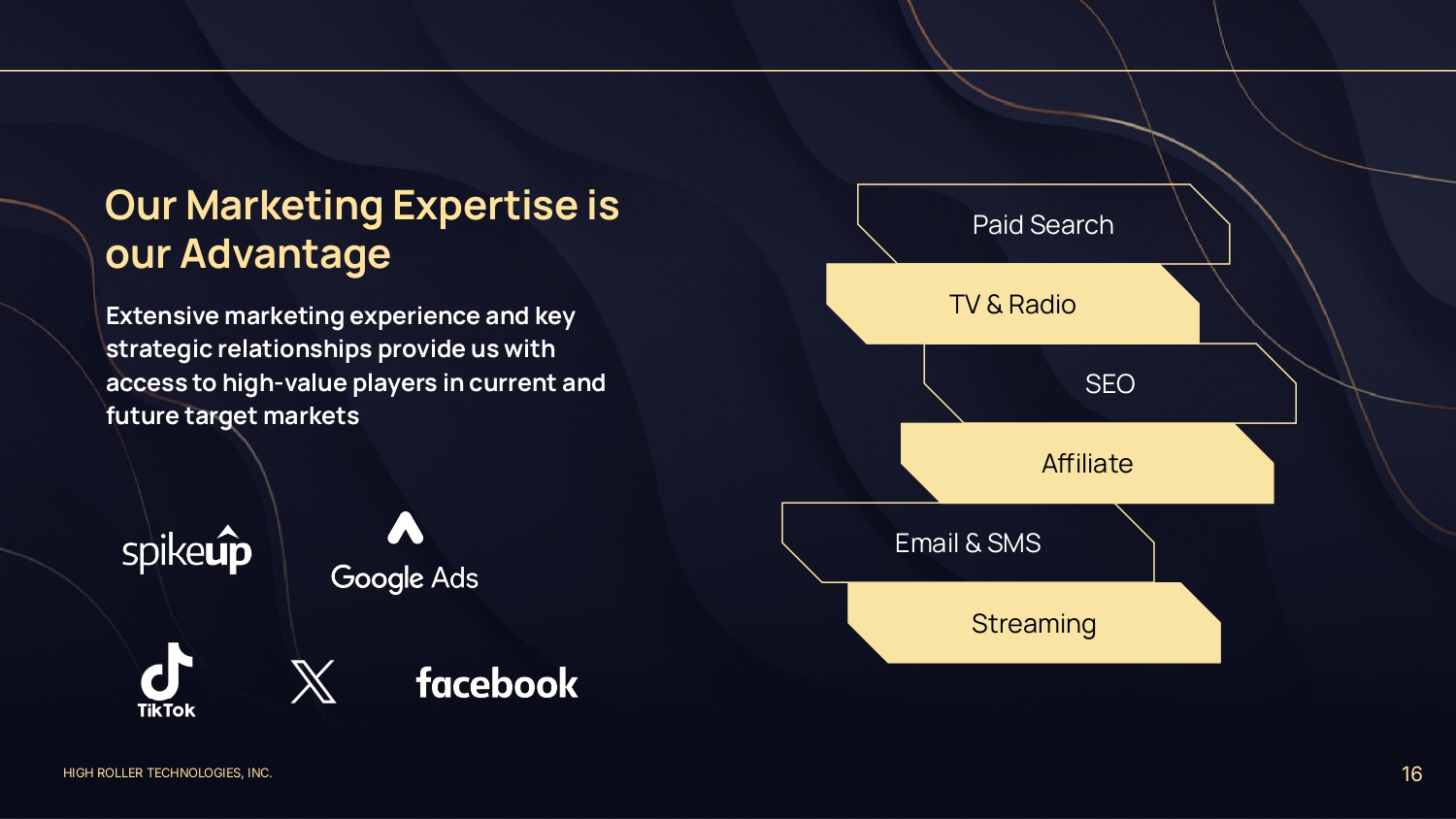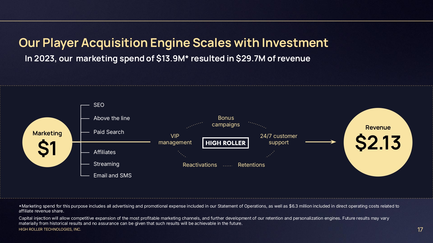Our Marketing Expertise is our Advantage Extensive marketing experience and key strategic relationships provide us with access to high-value players in current and future target markets Paid Search TV & Radio SEO A iliate Email & SMS Streaming HIGH ROLLER TECHNOLOGIES, INC. 16