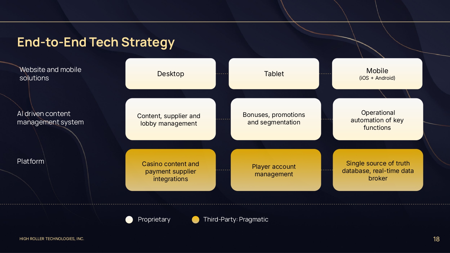 End-to-End Tech Strategy Website and mobile solutions AI driven content management system Platform Desktop Content, supplier and lobby management Casino content and payment supplier integrations Proprietary HIGH ROLLER TECHNOLOGIES, INC. Tablet Mobile (iOS Android) Bonuses, promotions and segmentation Operational automation of key functions Player account management Single source of truth database, real-time data broker Third-Party: Pragmatic 18