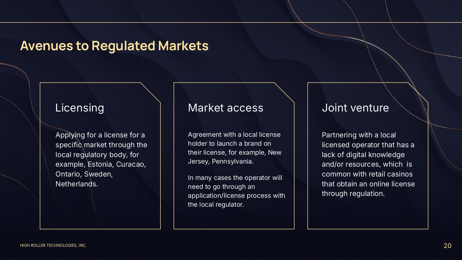 Avenues to Regulated Markets Licensing Market access Joint venture Applying for a license for a specific market through the local regulatory body, for example, Estonia, Curacao, Ontario, Sweden, Netherlands. Agreement with a local license holder to launch a brand on their license, for example, New Jersey, Pennsylvania. Partnering with a local licensed operator that has a lack of digital knowledge and/or resources, which is common with retail casinos that obtain an online license through regulation. HIGH ROLLER TECHNOLOGIES, INC. In many cases the operator will need to go through an application/license process with the local regulator. 20