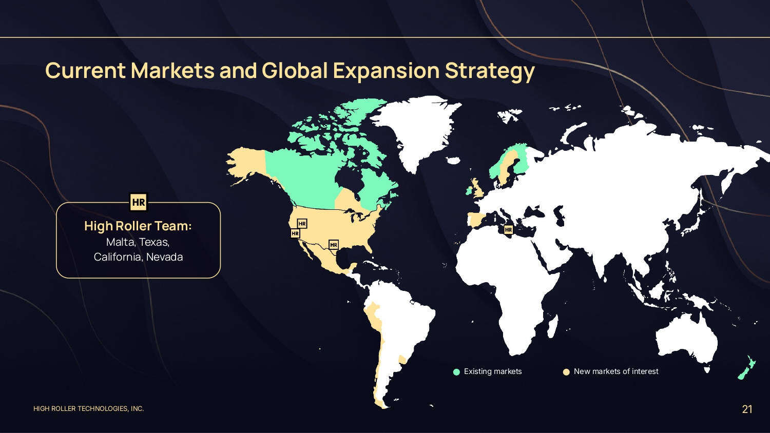 Current Markets and Global Expansion Strategy High Roller Team: Malta, Texas, California, Nevada Existing markets HIGH ROLLER TECHNOLOGIES, INC. New markets of interest 21