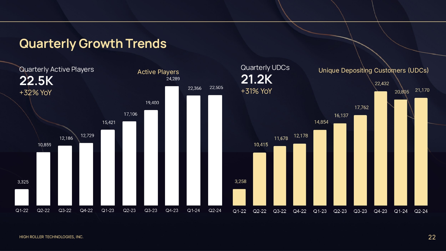 Quarterly Growth Trends Quarterly Active Players 22.5K +32% YoY HIGH ROLLER TECHNOLOGIES, INC. Active Players Quarterly UDCs 21.2K Unique Depositing Customers UDCs +31% YoY 22