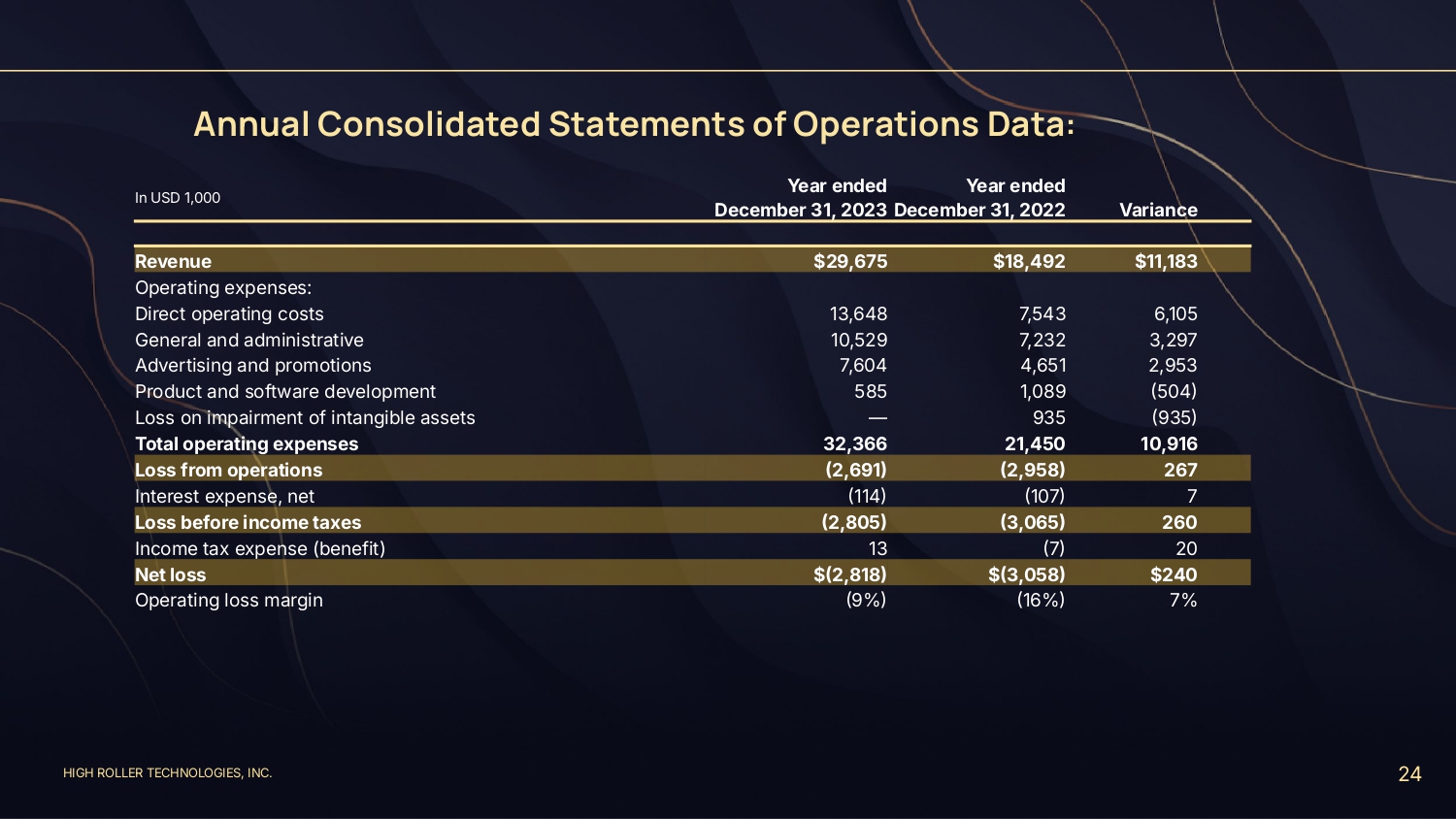 Annual Consolidated Statements of Operations Data: In USD 1,000 Revenue Operating expenses: Direct operating costs General and administrative Advertising and promotions Product and software development Loss on impairment of intangible assets Total operating expenses Loss from operations Interest expense, net Loss before income taxes Income tax expense (benefit) Net loss Operating loss margin HIGH ROLLER TECHNOLOGIES, INC. Year ended Year ended December 31, 2023 December 31, 2022 Variance $29,675 $18,492 $11,183 13,648 10,529 7,604 585 — 32,366 2,691 114 2,805 13 $ 2,818 9% 7,543 7,232 4,651 1,089 935 21,450 2,958 107 3,065 7 $ 3,058 16% 6,105 3,297 2,953 504 935 10,916 267 7 260 20 $240 7% 24