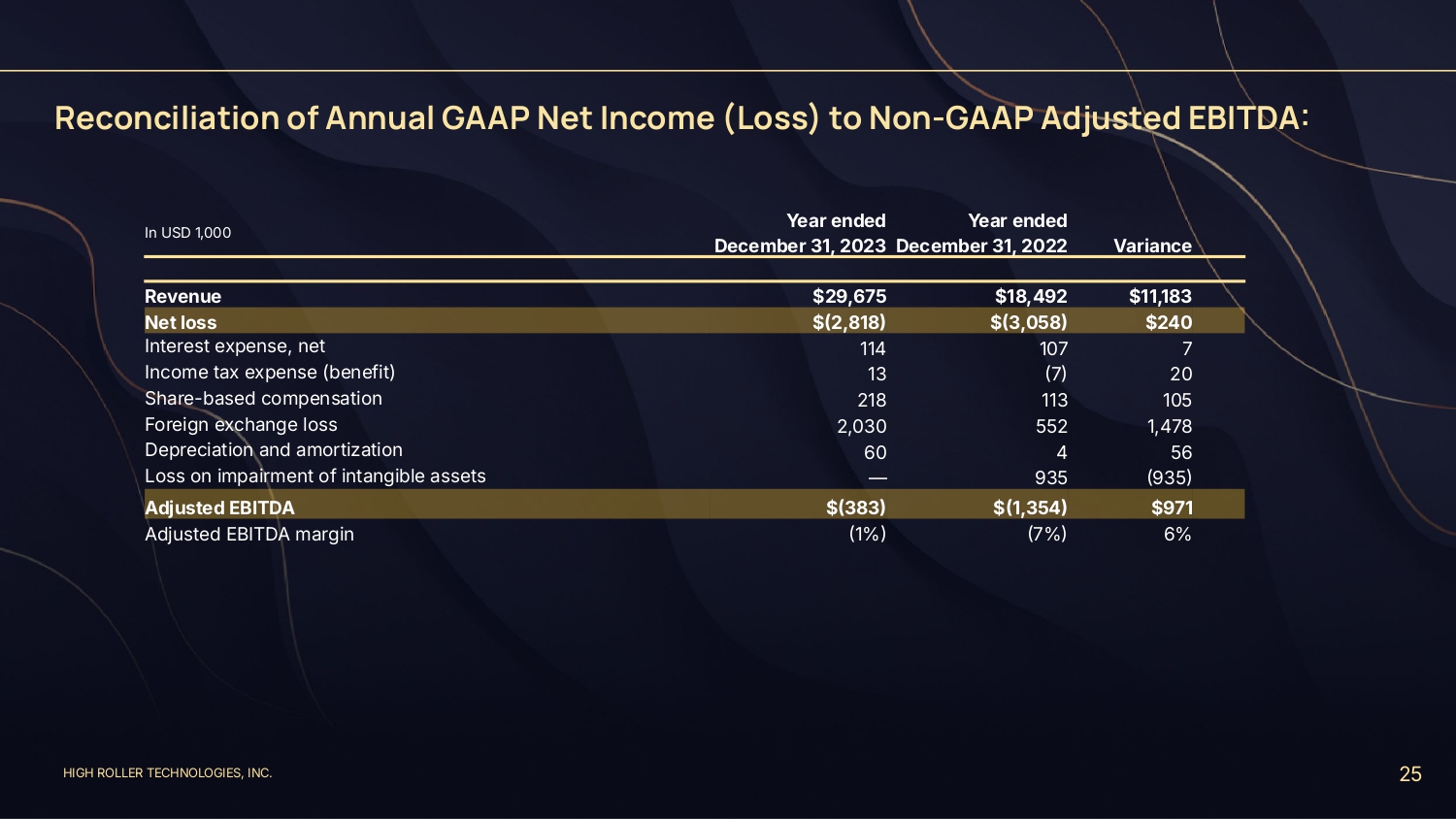 Reconciliation of Annual GAAP Net Income (Loss) to Non-GAAP Adjusted EBITDA: In USD 1,000 Revenue Net loss Interest expense, net Income tax expense (benefit) Share-based compensation Foreign exchange loss Depreciation and amortization Loss on impairment of intangible assets Adjusted EBITDA Adjusted EBITDA margin HIGH ROLLER TECHNOLOGIES, INC. Year ended Year ended December 31, 2023 December 31, 2022 Variance $29,675 $ 2,818 114 13 218 2,030 60 — $18,492 $ 3,058 107 7 113 552 4 935 $11,183 $240 7 20 105 1,478 56 935 $ 383 1% $ 1,354 7% $971 6% 25