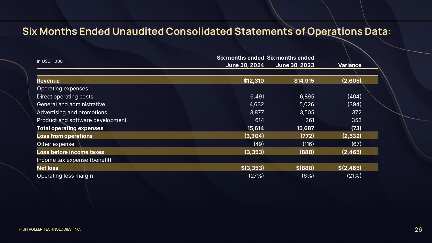 Six Months Ended Unaudited Consolidated Statements of Operations Data: In USD 1,000 Revenue Operating expenses: Direct operating costs General and administrative Advertising and promotions Product and software development Total operating expenses Loss from operations Other expense Loss before income taxes Income tax expense (benefit) Net loss Operating loss margin HIGH ROLLER TECHNOLOGIES, INC. Six months ended Six months ended June 30, 2024 June 30, 2023 Variance $12,310 $14,915 2,605 6,491 4,632 3,877 614 15,614 3,304 49 3,353 — $ 3,353 27% 6,895 5,026 3,505 261 15,687 772 116 888 — $ 888 6% 404 394 372 353 73 2,532 67 2,465 — $ 2,465 21% 26