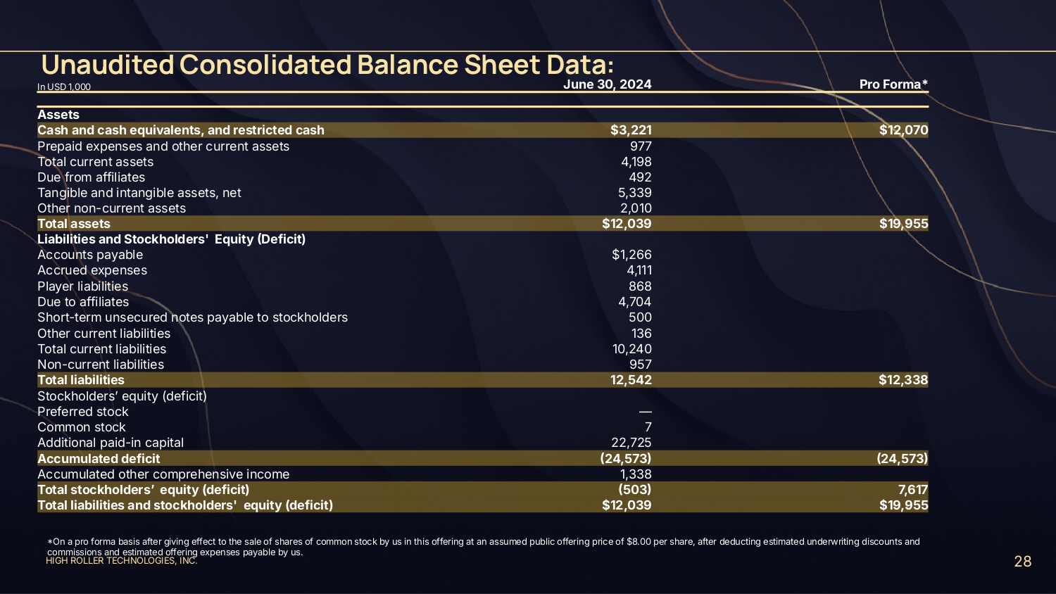 Unaudited Consolidated Balance Sheet Data: In USD 1,000 Assets Cash and cash equivalents, and restricted cash Prepaid expenses and other current assets Total current assets Due from affiliates Tangible and intangible assets, net Other non-current assets Total assets Liabilities and Stockholders' Equity Deficit) Accounts payable Accrued expenses Player liabilities Due to affiliates Short-term unsecured notes payable to stockholders Other current liabilities Total current liabilities Non-current liabilities Total liabilities Stockholdersʼ equity (deficit) Preferred stock Common stock Additional paid-in capital Accumulated deficit Accumulated other comprehensive income Total stockholdersʼ equity (deficit) Total liabilities and stockholders' equity (deficit) June 30, 2024 Pro Forma* $3,221 977 4,198 492 5,339 2,010 $12,039 $12,070 $19,955 $1,266 4,111 868 4,704 500 136 10,240 957 12,542 $12,338 — 7 22,725 24,573 1,338 503 $12,039 24,573 7,617 $19,955 On a pro forma basis after giving effect to the sale of shares of common stock by us in this offering at an assumed public offering price of $8.00 per share, after deducting estimated underwriting discounts and commissions and estimated offering expenses payable by us. HIGH ROLLER TECHNOLOGIES, INC. 28