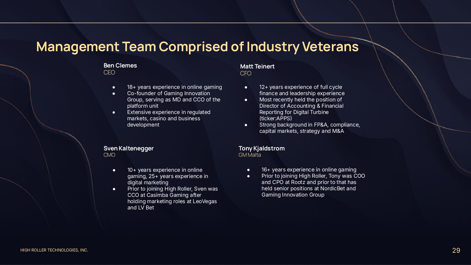Management Team Comprised of Industry Veterans Ben Clemes CEO ● ● ● 18+ years experience in online gaming Co-founder of Gaming Innovation Group, serving as MD and CCO of the platform unit Extensive experience in regulated markets, casino and business development Sven Kaltenegger CMO ● ● HIGH ROLLER TECHNOLOGIES, INC. 10+ years experience in online gaming, 25+ years experience in digital marketing Prior to joining High Roller, Sven was CCO at Casimba Gaming after holding marketing roles at LeoVegas and LV Bet Ma Teinert CFO ● ● ● 12+ years experience of full cycle finance and leadership experience Most recently held the position of Director of Accounting & Financial Reporting for Digital Turbine (ticker:APPS Strong background in FP&A, compliance, capital markets, strategy and M&A Tony Kjaldstrom GM Malta ● ● 16+ years experience in online gaming Prior to joining High Roller, Tony was COO and CPO at Rootz and prior to that has held senior positions at NordicBet and Gaming Innovation Group 29