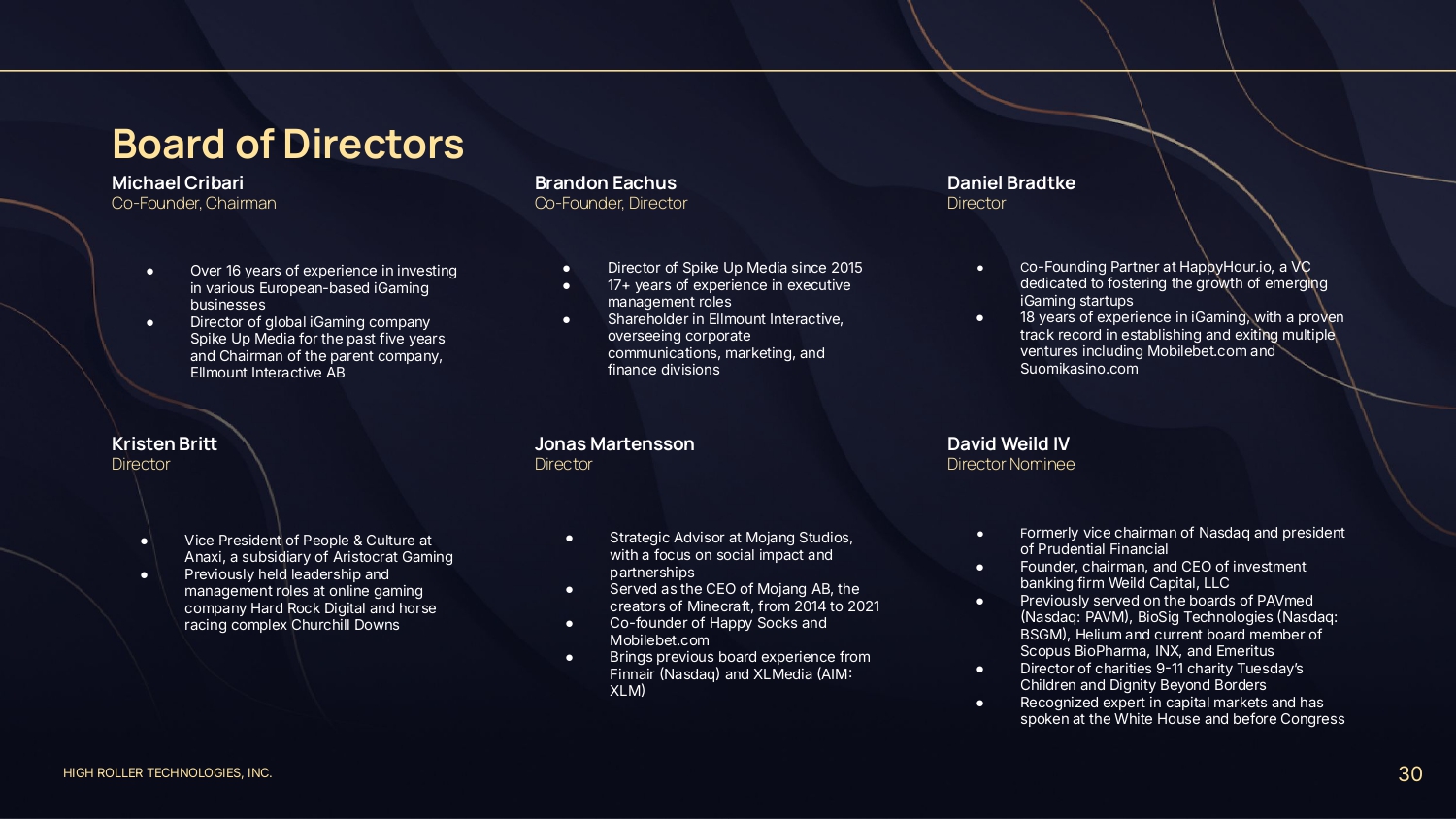 Board of Directors Michael Cribari Co-Founder, Chairman ● ● Over 16 years of experience in investing in various European-based iGaming businesses Director of global iGaming company Spike Up Media for the past five years and Chairman of the parent company, Ellmount Interactive AB Kristen Bri Director ● ● Vice President of People & Culture at Anaxi, a subsidiary of Aristocrat Gaming Previously held leadership and management roles at online gaming company Hard Rock Digital and horse racing complex Churchill Downs Brandon Eachus Co-Founder, Director ● ● ● Jonas Martensson Director ● ● ● ● HIGH ROLLER TECHNOLOGIES, INC. Director of Spike Up Media since 2015 17+ years of experience in executive management roles Shareholder in Ellmount Interactive, overseeing corporate communications, marketing, and finance divisions Strategic Advisor at Mojang Studios, with a focus on social impact and partnerships Served as the CEO of Mojang AB, the creators of Minecraft, from 2014 to 2021 Co-founder of Happy Socks and Mobilebet.com Brings previous board experience from Finnair Nasdaq and XLMedia AIM XLM Daniel Bradtke Director ● ● Co-Founding Partner at HappyHour.io, a VC dedicated to fostering the growth of emerging iGaming startups 18 years of experience in iGaming, with a proven track record in establishing and exiting multiple ventures including Mobilebet.com and Suomikasino.com David Weild IV Director Nominee ● ● ● ● ● Formerly vice chairman of Nasdaq and president of Prudential Financial Founder, chairman, and CEO of investment banking firm Weild Capital, LLC Previously served on the boards of PAVmed Nasdaq: PAVM , BioSig Technologies Nasdaq: BSGM , Helium and current board member of Scopus BioPharma, INX, and Emeritus Director of charities 911 charity Tuesdayʼs Children and Dignity Beyond Borders Recognized expert in capital markets and has spoken at the White House and before Congress 30