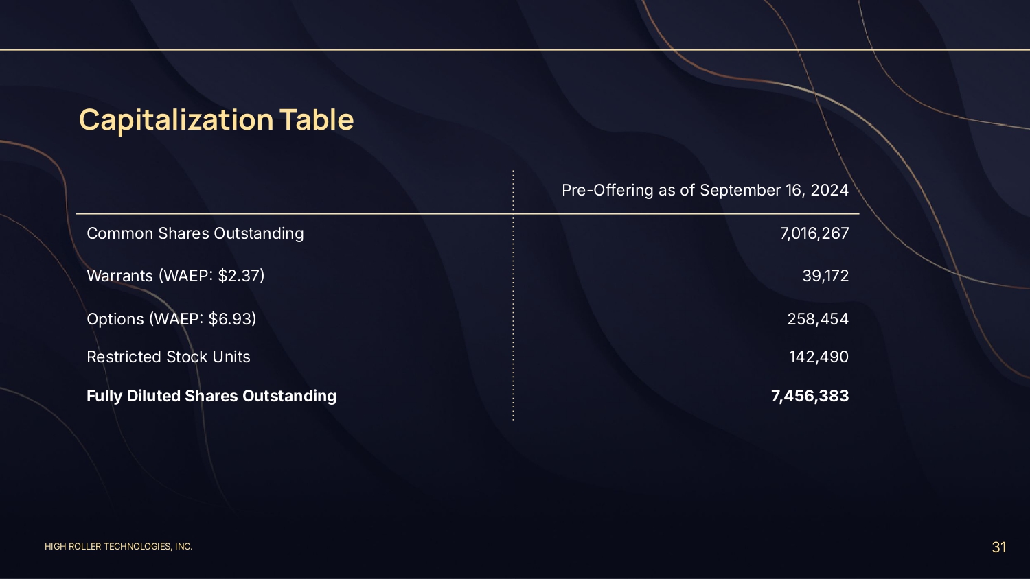 Capitalization Table Pre-Offering as of September 16, 2024 Common Shares Outstanding Warrants WAEP $2.37 7,016,267 39,172 Options WAEP $6.93 258,454 Restricted Stock Units 142,490 Fully Diluted Shares Outstanding HIGH ROLLER TECHNOLOGIES, INC. 7,456,383 31