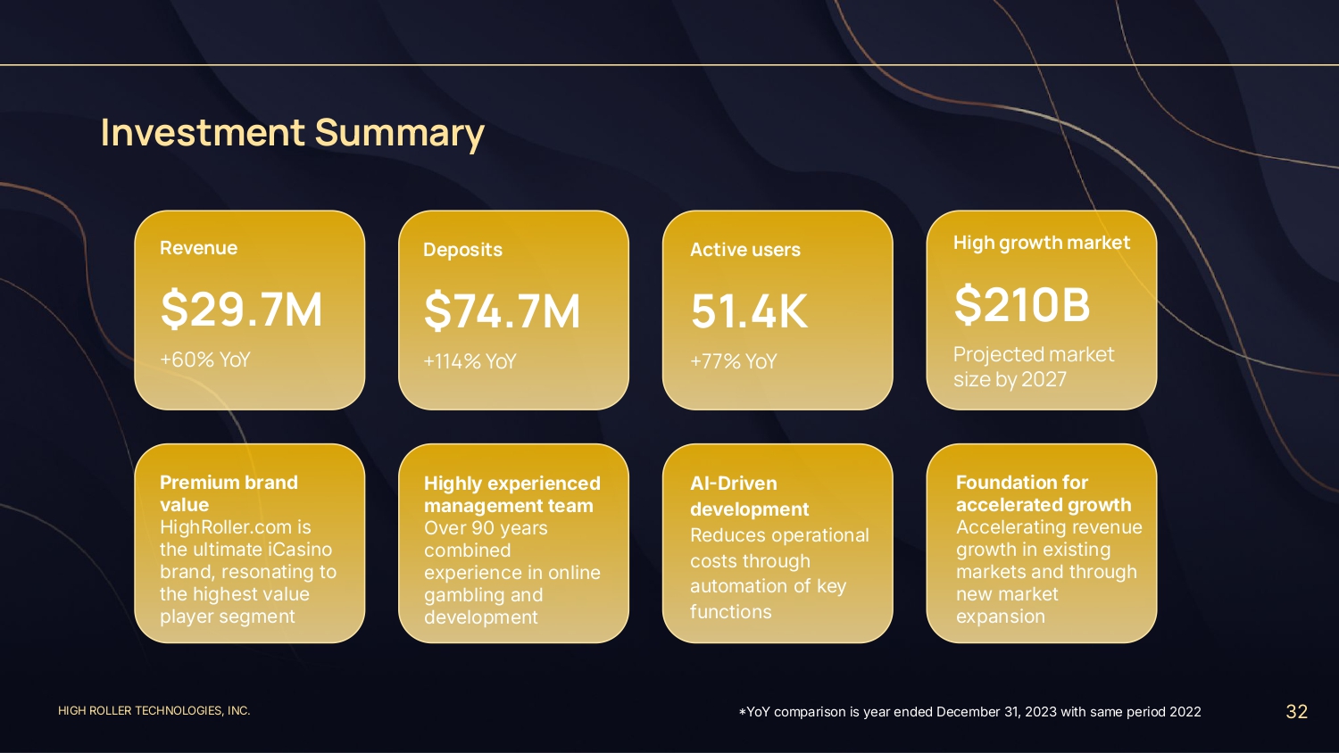 Investment Summary Revenue Deposits Active users High growth market $29.7M $74.7M 51.4K $210B +60% YoY +114% YoY +77% YoY Projected market size by 2027 Premium brand value HighRoller.com is the ultimate iCasino brand, resonating to the highest value player segment Highly experienced management team Over 90 years combined experience in online gambling and development AIDriven development Reduces operational costs through automation of key functions Foundation for accelerated growth Accelerating revenue growth in existing markets and through new market expansion HIGH ROLLER TECHNOLOGIES, INC. YoY comparison is year ended December 31, 2023 with same period 2022 32